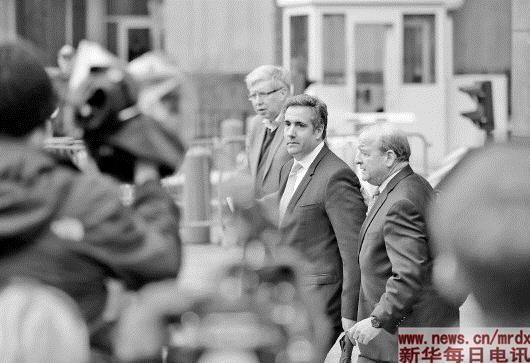 4月16日,在美国纽约曼哈顿联邦地区法院外,美国总统特朗普私人律师科亨(中)出庭后准备离开。