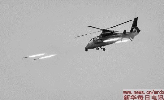 新型武装直升机发射火箭弹(4月18日摄)。 4月18日,根据年度例行性计划安排,我陆军航空兵部队在东南沿海举行跨昼夜海上实弹射击演练,多型武装直升机密切配合,高效协同,全面检验陆航部队海上全天候作战能力。