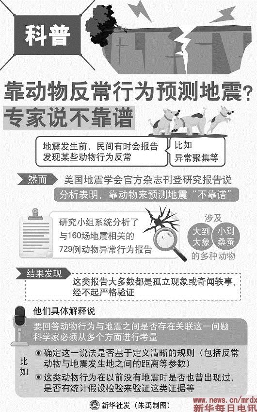 新华社北京4月19日电(记者张忠霞)地震发生前,民间有时会报告发现某些动物行为反常,比如异常聚集等。然而,美国地震学会官方杂志刊登研究报告说,分析表明,靠动物来预测地震“不靠谱”。