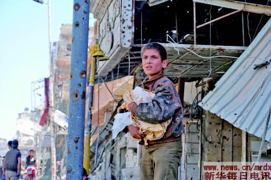 4月16日,在叙利亚大马士革东郊杜马镇,一名儿童在街边领取大饼。