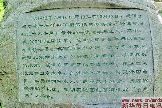 ▲武汉东湖梅岭毛泽东故居陈列馆外,毛泽东与东湖宾馆的文字介绍。