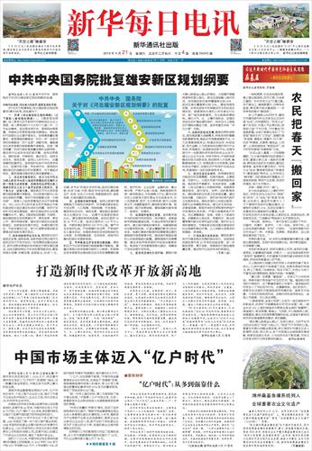 | ( 2018-04-21 ) 稿件来源: 新华每日电讯头版新闻 |