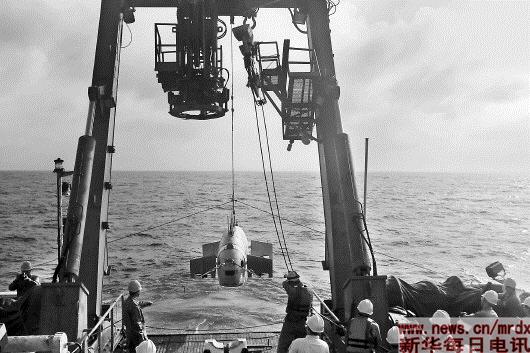 ▲4月20日,科考队员在回收首次下潜归来的“潜龙三号”。