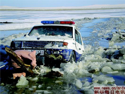▲2006年11月13日,达赉湖公安分局执勤车辆在冰面上遇险。