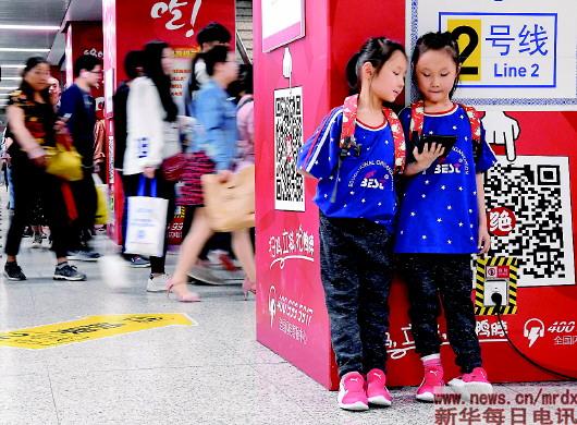 ▲在河南省郑州市紫荆山地铁站,一对双胞胎姐妹在阅读电子书(4月20日摄)。