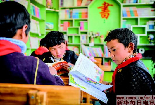 ▲西藏林芝市工布江达县仲莎乡中心小学学生在校图书室内看书(4月18日摄)。