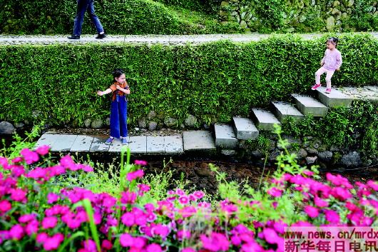 小朋友在浙江省衢州江山市石门镇清漾村的溪水边玩耍(4月20日摄)。2006年起,以“书香清漾”著称的清漾村以村庄景区化为抓手,通过垃圾分类整治、农村生活污水治理、庭院美化等一系列生态整治举措,打造了一个村道整洁、河流清澈、民房漂亮、庭院优美、花圃遍地,处处成风景的生态宜居村庄。