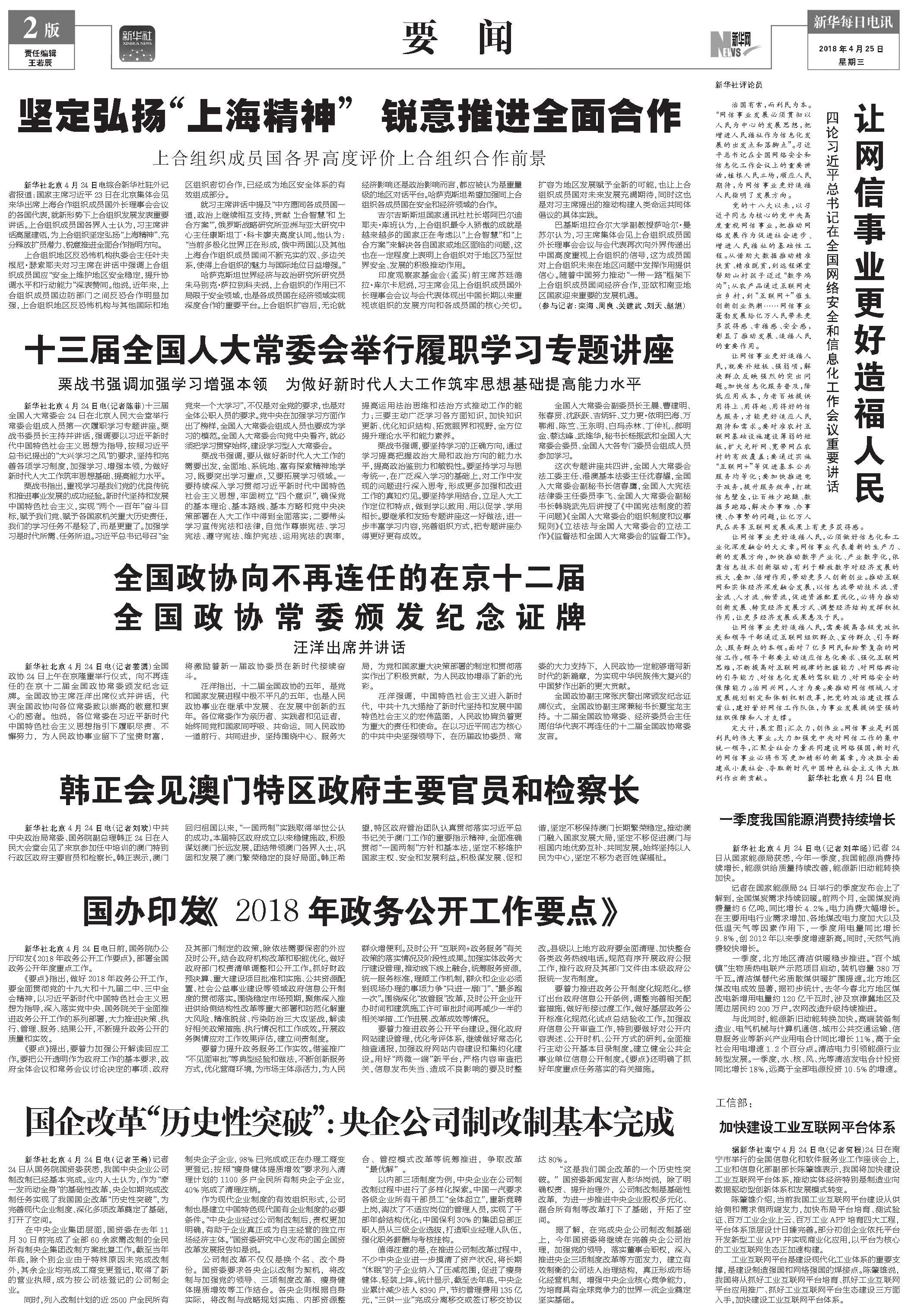 坚定弘扬“上海精神” 锐意推进全面合作 (2018年04月25日) |