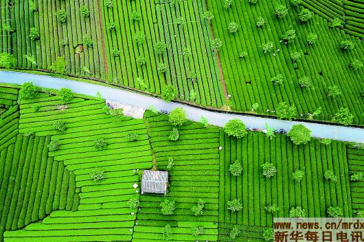 俯瞰浙江省松阳县新兴镇大木山骑行茶园(4月24日无人机拍摄)。大木山茶园将自行车骑行运动与茶园观光休闲融合,实现了种植效益和景观效益的叠加,成为农旅融合发展的示范。