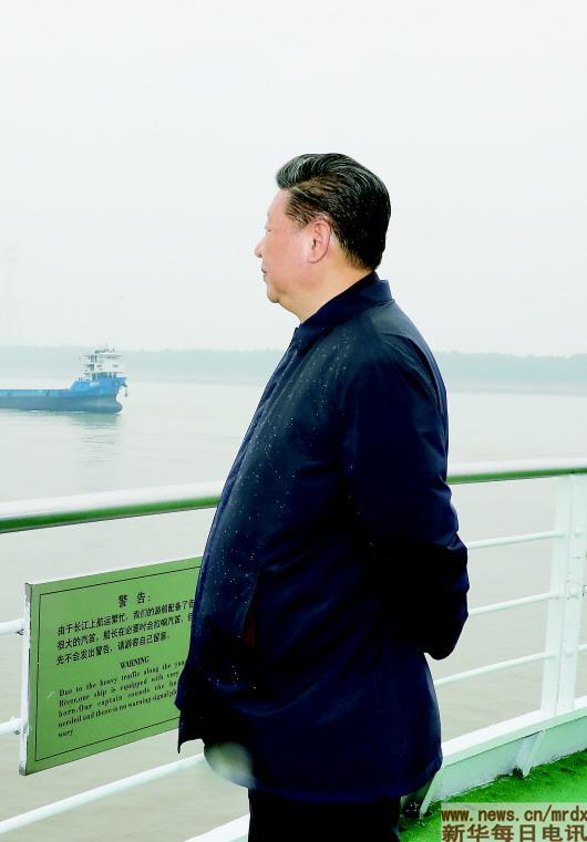 ▲这是座谈会前,习近平于25日上午乘船沿江察看两岸生态环境和发展建设情况。