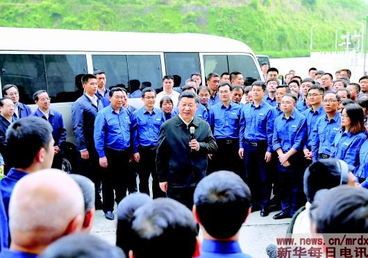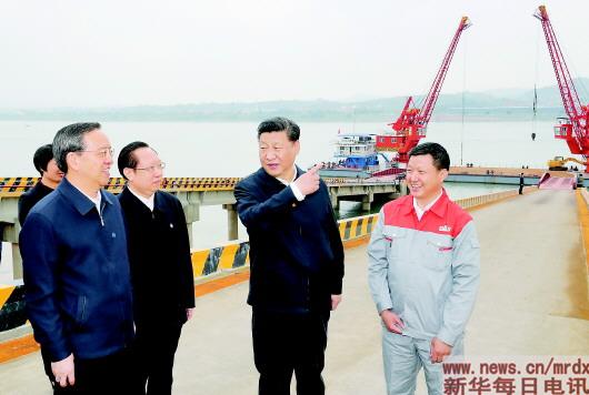 ▲4月26日下午,中共中央总书记、国家主席、中央军委主席习近平在武汉主持召开深入推动长江经济带发展座谈会并发表重要讲话。这是座谈会前,习近平于24日中午到兴发集团宜昌新材料产业园,察看化工企业搬迁、改造以及码头复绿情况。