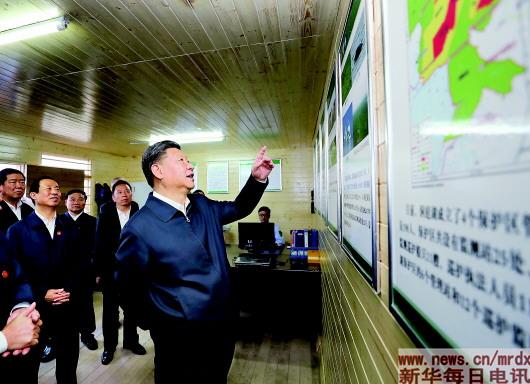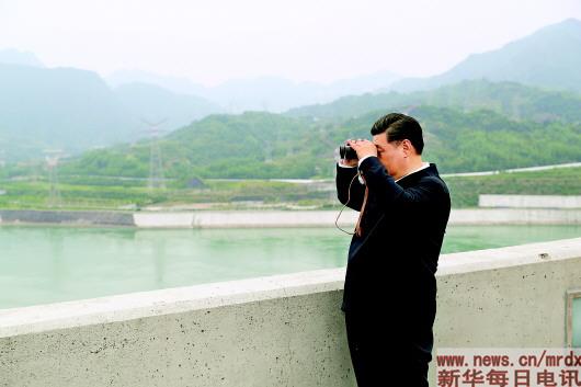 ▲这是座谈会前,习近平于24日下午在三峡大坝坝顶察看三峡工程和坝区周边生态环境。