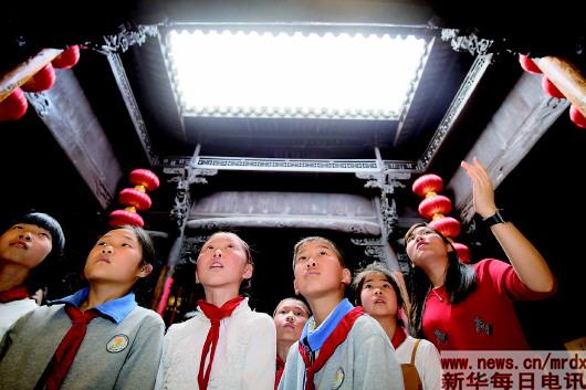 | 4月25日,在浙江省建德市上吴方村家训馆,小学生在老师的带领下了解家风家训传统。 本报记者翁忻旸摄 |