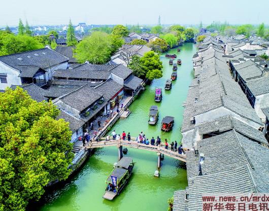| 游客在浙江省桐乡市乌镇景区内观看当地的水上民俗表演(4月1日无人机拍摄)。 本报记者徐昱摄 |