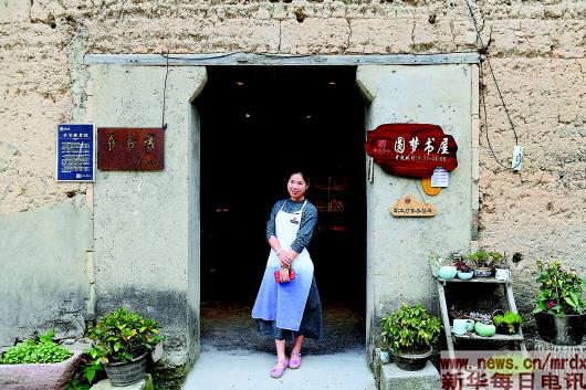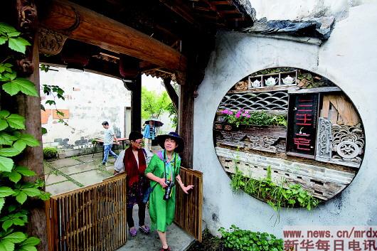 游客走出浙江省桐庐县江南镇深澳村三生一宅民宿大门(4月23日摄)。