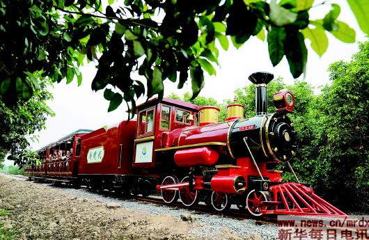 | 游客和工作人员在乘坐试通车的浙江奉化滕头村村内游览小火车(4月23日摄)。 本报记者殷刚摄 |