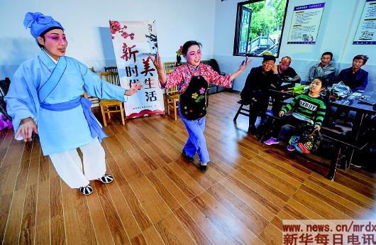 | 浙江省桐乡市屠甸镇汇丰村村民在文化礼堂茶馆内观看当地石泾艺术团表演的越剧(4月23日摄)。 本报记者徐昱摄 |