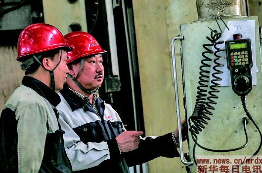 | 徐宝军(下图中),沈阳机床股份有限公司沈阳第一机床厂车工。参加工作33年,他从一名普通工人成长为机床调控专家。2014年,“徐宝军创新工作室”成立,先后完成创新攻关项目25项,为企业创造经济效益1亿多元(4月9日摄,拼版照片)。 新华社记者杨青摄 |