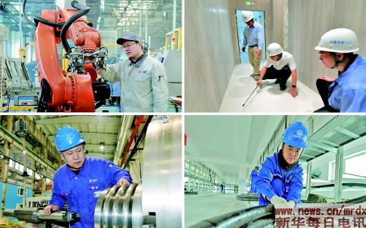右上:4月27日,黄松源(中)在深圳平安金融中心南塔内部检查空鼓情况。新华社记者毛思倩摄 左下:“首届中国质量工匠”、哈尔滨电机厂有限责任公司车工裴永斌在车间工作(资料照片)。新华社发 右下:在黑龙江省尚志市帽儿山车站,中铁一局电务公司工人在施工现场为信号设备布线(4月23日摄)。新华社发(牛荣健摄)
