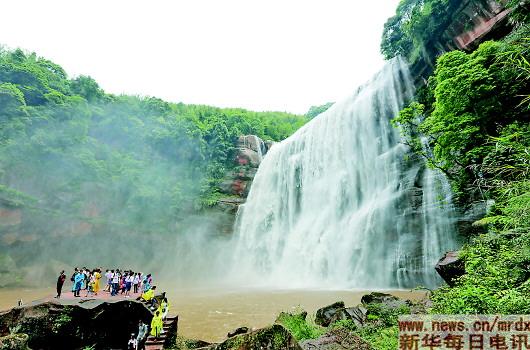4月30日,游客在贵州赤水丹霞旅游区的大瀑布景区游览。“五一”小长假期间,人们以不同方式度过多彩的假期。