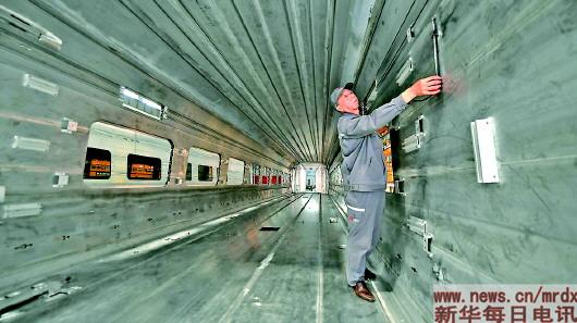 ▲李学忠在中车长客股份公司铝车体二车间对一台在造的“复兴号”进行测量(4月24日摄)。