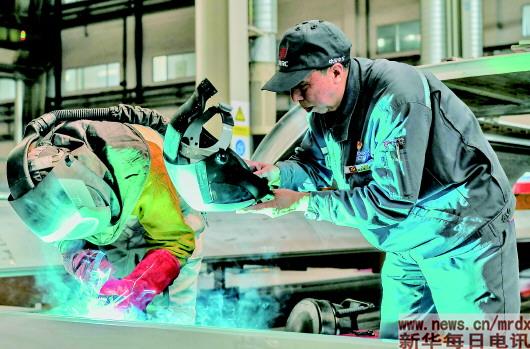 ▲李学忠(右)在中车长客股份公司铝车体二车间内指导工人操作(4月24日摄)。