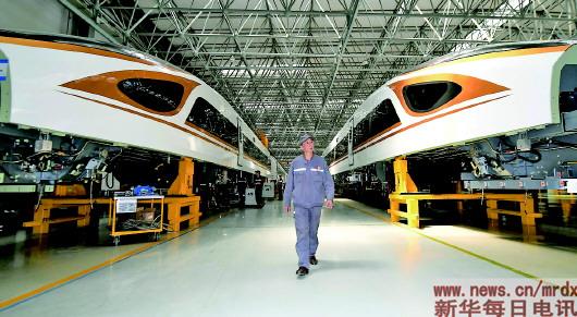 ▲李学忠行走在中车长客股份公司高速动车组装配一车间内,他身后是在造的“复兴号”(4月24日摄)。
