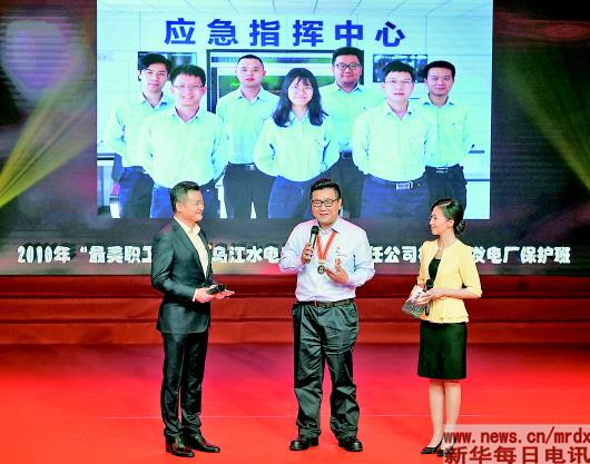 ▲贵州乌江水电开发有限责任公司构皮滩发电厂保护班班长李霄在“最美职工”发布仪式上(4月25日摄)。