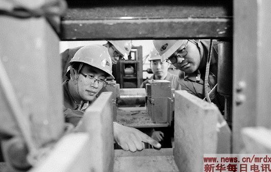 ▲5月3日,李敬刚(前左)在车间指导年轻工人工作。