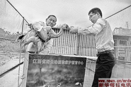 5月7日,江西省野生动植物救护繁育中心的工作人员将小白鹤装入特制木箱,正式踏上千里“寻亲之旅”。