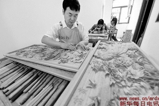 ▲江西省原创工艺美术大师洪雁球在木板上雕刻图案(5月7日摄)。2013年以来,江西余江县积极创建雕刻创业示范街、雕刻创业示范园等雕刻产业平台,吸引一大批余江籍雕刻人才返乡创业。据悉,目前余江县从事木雕的3万多人中,有3000多人是返乡创业人员。2017年余江县雕刻产业实现主营业务收入16.3亿元。