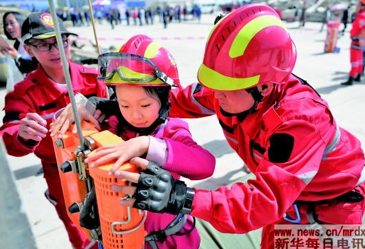 ▲5月12日,小朋友在兰州国家陆地搜寻与救护基地体验应急逃生装备。当日是全国防灾减灾日,兰州国家陆地搜寻与救护基地举行公众开放日活动。 新华社记者陈斌摄