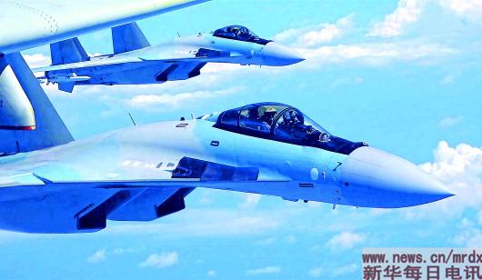5月11日,空军苏-35战机与轰-6K战机编队飞行。新华社发(刘锐摄)