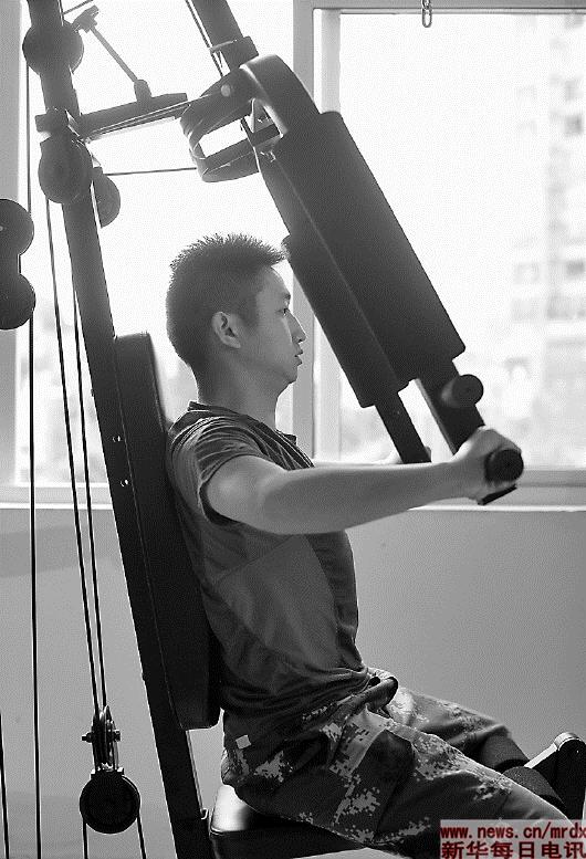 ▲5月7日,蒋雨航在贵州省凯里市的黔东南消防支队战情保障大队健身房锻炼身体。新华社记者江宏景摄 |
