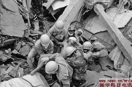 ▲被压在废墟下近125小时后,20岁的蒋雨航被搜救队员从映秀镇都汶公路收费站宿舍的废墟中救出(2008年5月17日17时12分摄)。 |