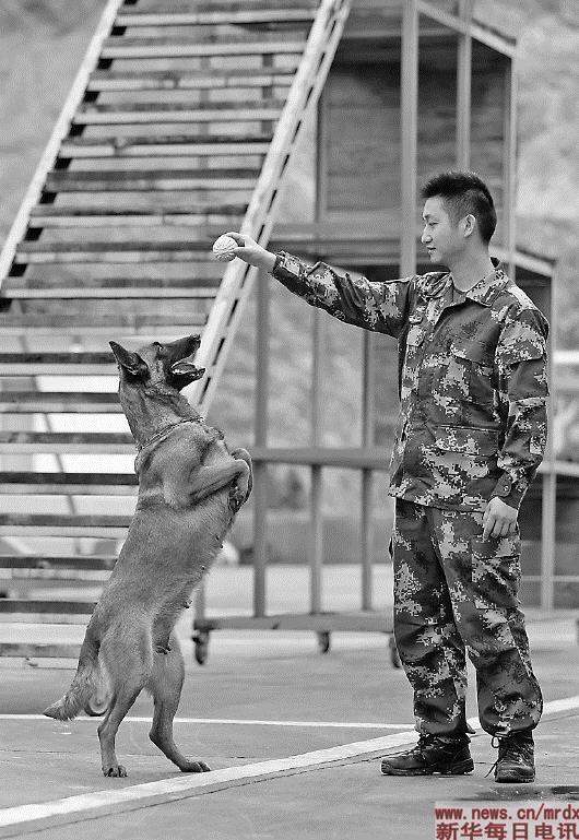 ▲5月7日,在贵州省凯里市的黔东南消防支队战情保障大队,蒋雨航与搜救犬四喜在一起。新华社记者江宏景摄 |