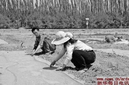▲中国科学院新疆生态与地理研究所学生李言言(右)、曹登超在实验地里工作(4月24日摄)。新华社记者白佳丽摄