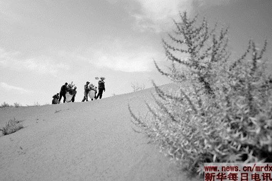 ▲4月25日,在腾格里沙漠的一个治沙林场,王森(前一)带领林场员工植树。新华社发(王朋摄)