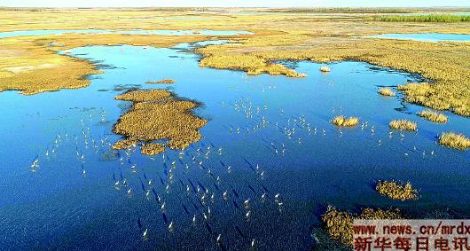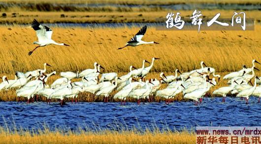 | 4月29日,白鹤群在莫莫格湿地栖息。 |