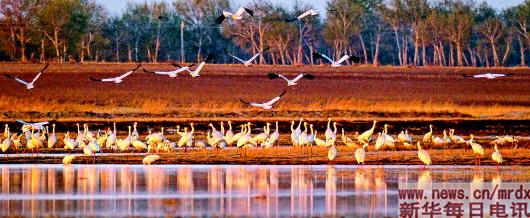 | 4月29日,白鹤群在夕阳中的莫莫格湿地栖息飞翔。 |