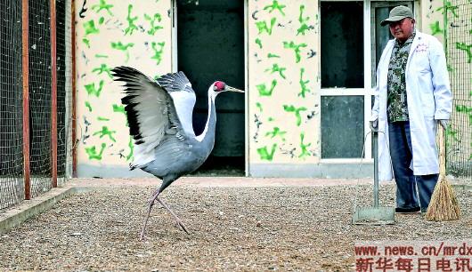 | 4月29日,莫莫格国家级自然保护区工作人员在一只被救护的白枕鹤笼子里打扫卫生。 |
