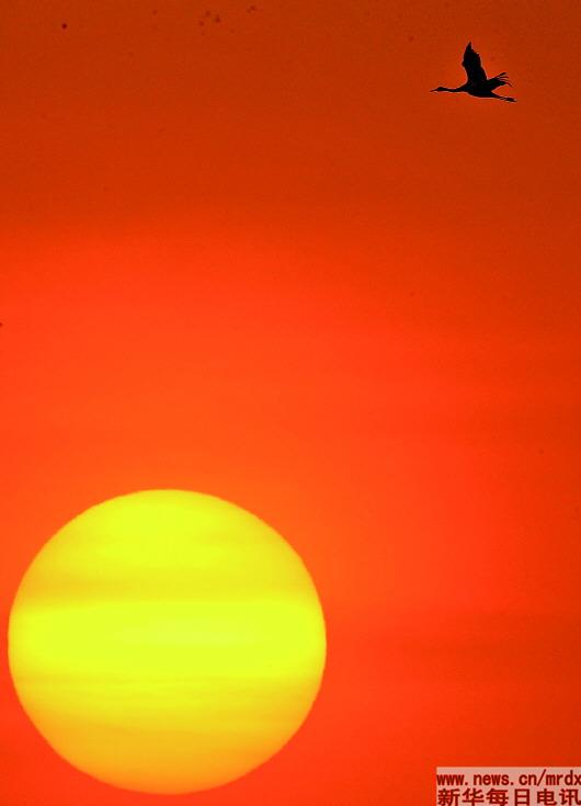 4月29日,一只白鹤在朝阳中的莫莫格湿地上空飞翔。 |