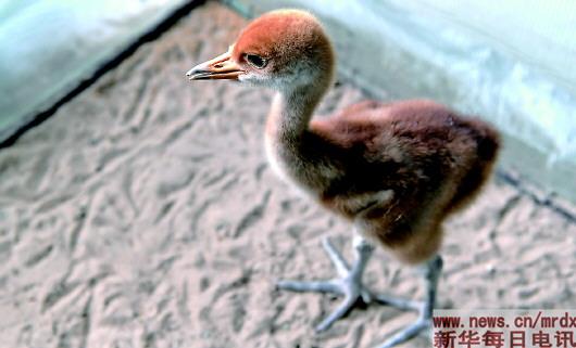 莫莫格国家级自然保护区人工繁育区里一只出壳11天的丹顶鹤宝宝(4月29日摄)。 |