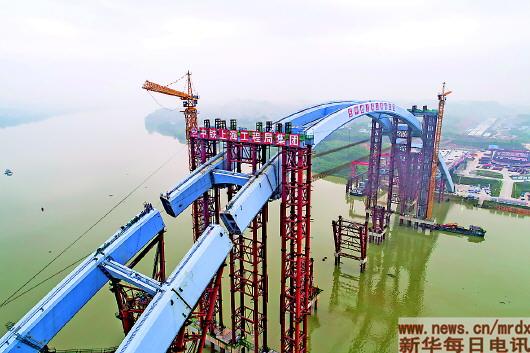 5月14日,广西柳州官塘大桥的5885吨中拱段整体提升到位。柳州官塘大桥跨度达457米,大桥一跨过江,水中不设桥墩。新华社发(李斌摄)