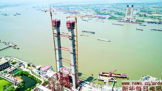 5月15日,五峰山长江大桥南主塔成功封顶。五峰山长江大桥是我国首座公铁两用悬索桥,预计2020年竣工通车。新华社记者李响摄