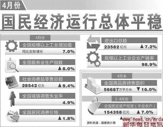 生产、需求、就业、物价等多方面显示经济运行总体平稳。从生产看,4月份,全国规模以上工业增加值增速比上月加快1个百分点。服务业生产指数增速虽有回落,但仍保持了8%的较快增长。