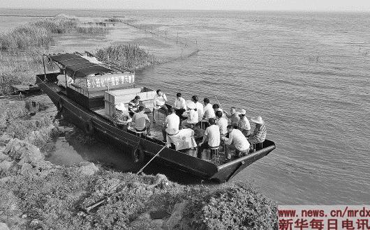 ▲5月15日,在洪泽湖畔泗阳县高渡镇高渡村一条渔船上,纪检监察干部在给当地村组党员干部上廉政教育课。