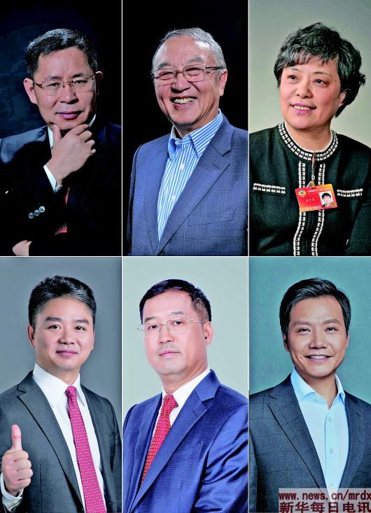 (上排由左至右)用友网络董事长兼CEO王文京,联想控股董事长、联想集团创始人柳传志,时代集团公司总裁王小兰;(下排由左至右)京东集团董事局主席兼CEO刘强东,利亚德创始人李军,小米科技董事长兼CEO雷军(拼版照片)。新华社发