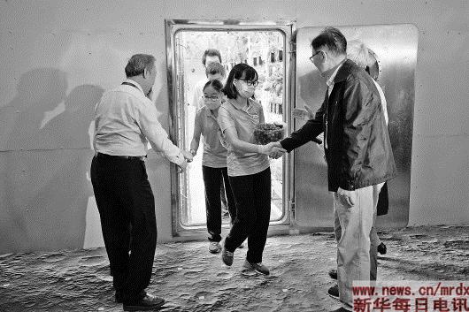 ▲5月15日,“月宫一号”实验室内,志愿者刘慧(中)与其他三位志愿者走出舱门。新华社记者鞠焕宗摄