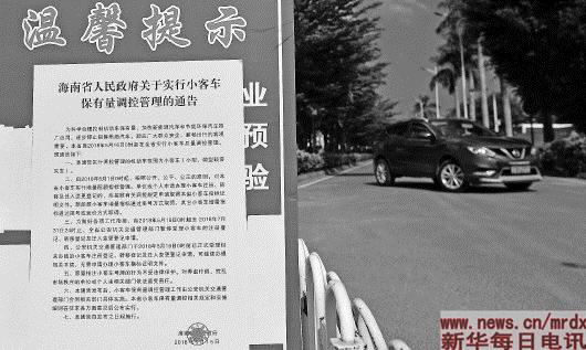 海口市公安局第一车辆管理所门口张贴的《通告》(5月16日摄)。5月15日晚间,海南省人民政府举行新闻发布会,发布《关于实行小客车保有量调控管理通告》,自2018年5月16日0时起,海南在全省实行小客车总量调控管理。《通告》实行调控管理的机动车范围为小客车(小型、微型载客汽车)。自2018年8月1日0时起,按照公开、公平、公正的原则,对海南省小客车实行增量配额指标管理。单位或个人申请办理小客车注册、转移及迁入变更登记的,应按照有关调控规定申请取得海南省小客车指标证明文件。新能源小客车增量指标通过排号方式取得,其它小客车增量指标通过摇号或竞价方式取得。新华社记者郭程摄